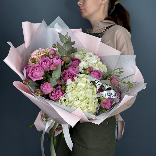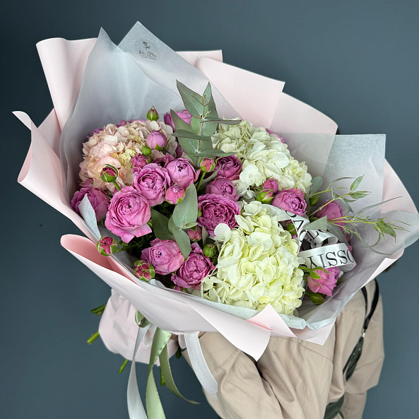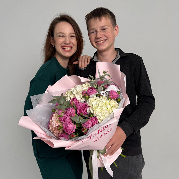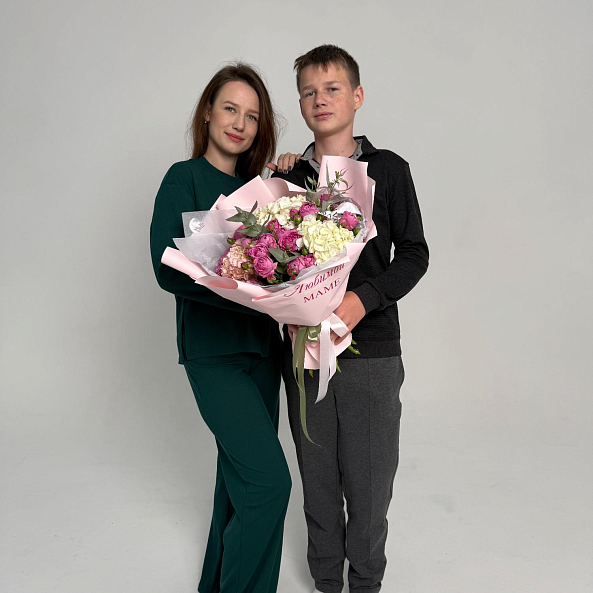 Букет цветов. "Любимой Маме". Кустовая Пионовидная Роза, Гортензия.