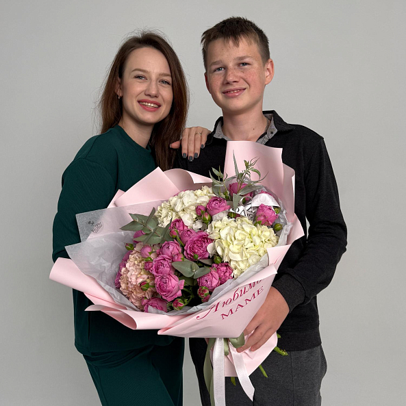 Нежный и трогательный букет «Любимой Маме» — пышные кустовые пионовидные розовые розы в оттенках розового и персикового гармонично сочетаются с воздушной белой и розовой гортензией. Упакован в нежно-розовую бумагу с надписью «Любимой Маме» — идеальный подарок, полный тепла, благодарности и любви.