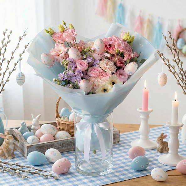 Этот очаровательный букет — настоящая симфония весеннего пробуждения, где пастельные оттенки и пасхальные символы сливаются в единый волшебный образ. В композиции переплетаются нежные розы, ароматные гвоздики, объемные гортензии и декоративные пасхальные яйца с цветочными узорами, словно застывший момент из детской сказки. Упакованный в светло-голубую кальку с белой лентой, букет выглядит лаконично и стильно, идеально дополняя как праздничный образ, так и интерьер.