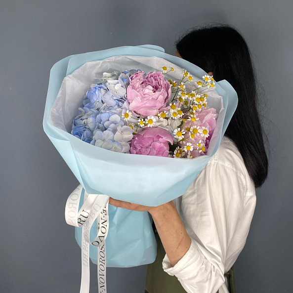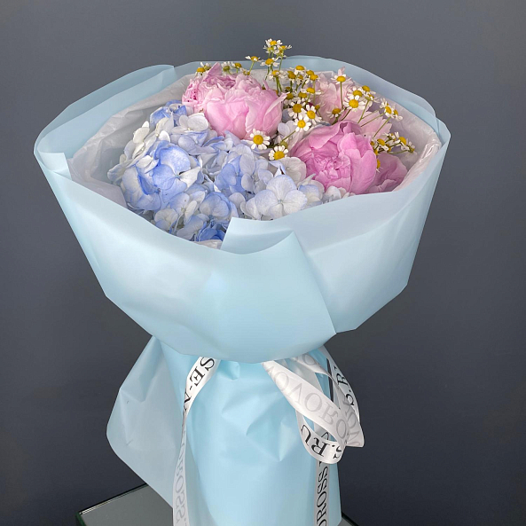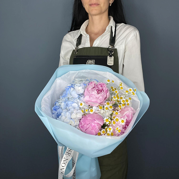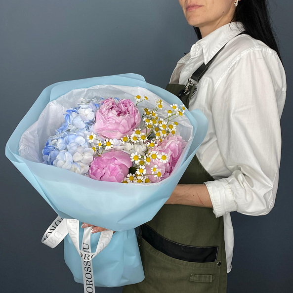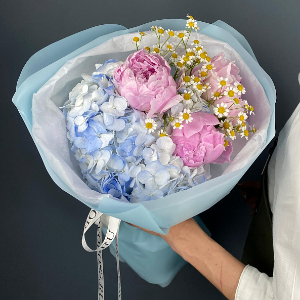 Лёгкий, воздушный букет, наполненный романтикой и естественной красотой. Сочетание пышного розового пиона, нежной голубой гортензии и скромной полевой ромашки создаёт гармонию, словно взятую с весеннего луга.
