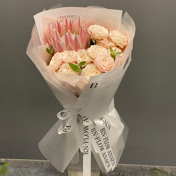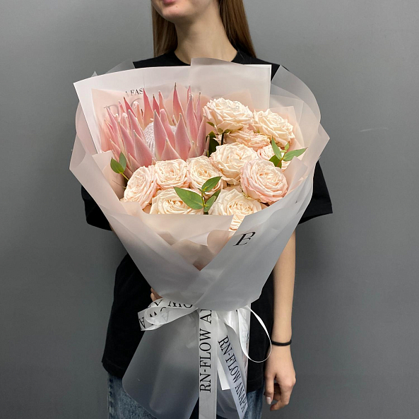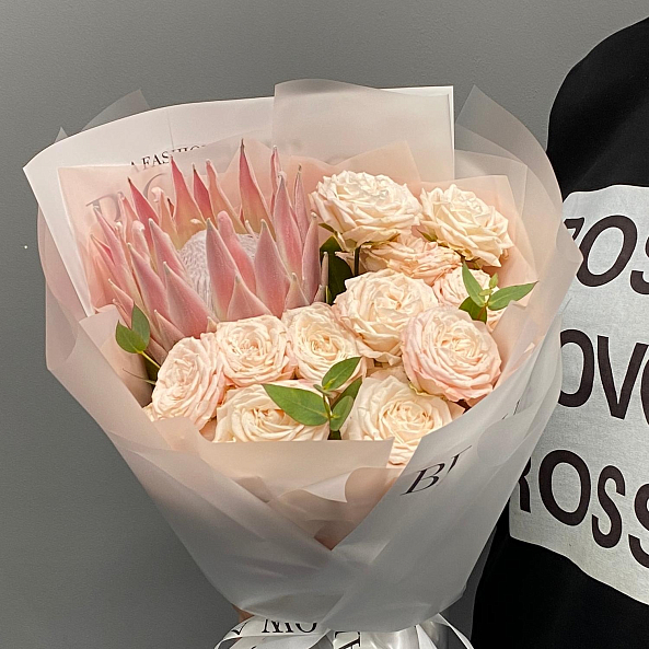 Этот букет — не просто цветы, а настоящая история: пышные кремово-розовые розы, словно вырезанные из атласа, и величественная протея с нежно-розовыми чашелистиками создают образ изысканной, но мягкой роскоши.