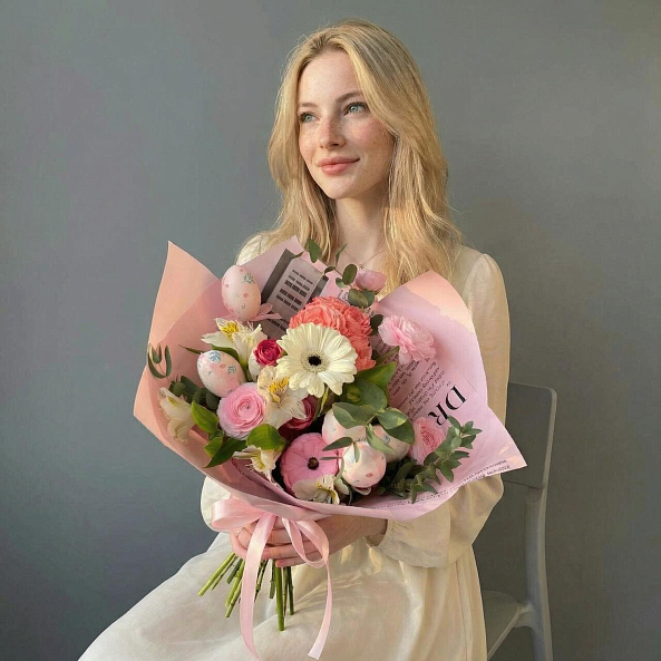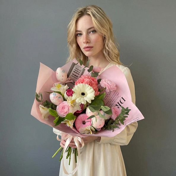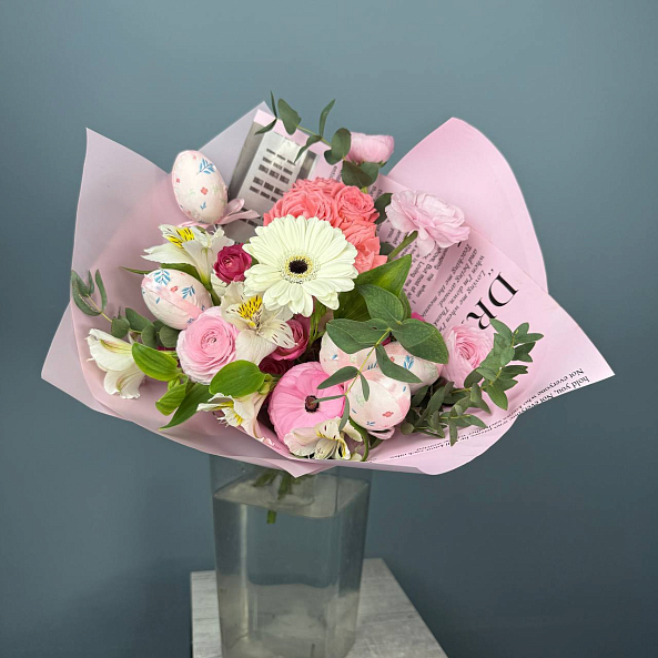 Букет цветов. Ранункулюс, Роза кустовая, Гербера, Альстромерия, Пасхальный Декор.