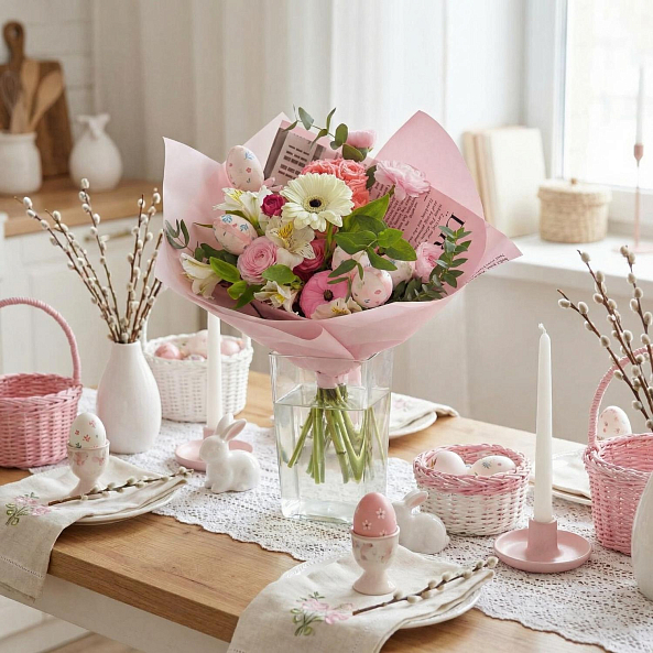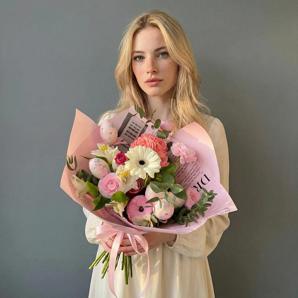 Этот очаровательный букет — настоящая симфония весеннего пробуждения, где нежные розовые и белые цветы и пасхальные символы сливаются в единый волшебный образ. В композиции переплетаются розовые розы, белые герберы, пастельные гвоздики, зеленый эвкалипт и декоративные пасхальные яйца с цветочными узорами, словно застывший момент из детской сказки.