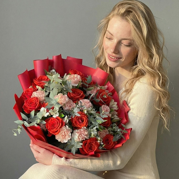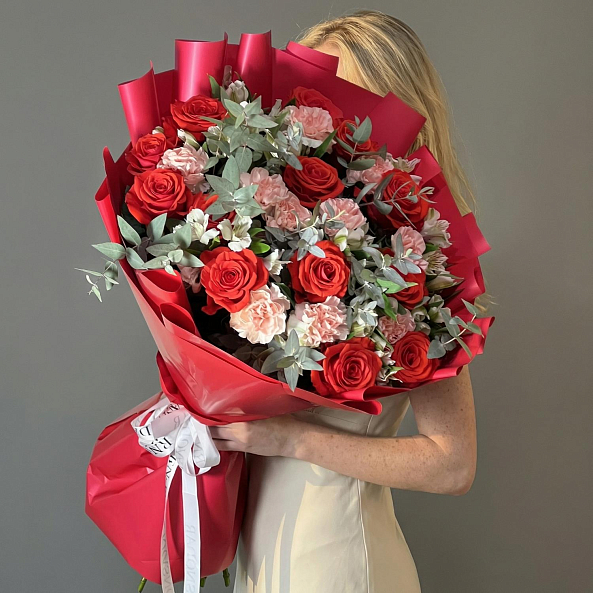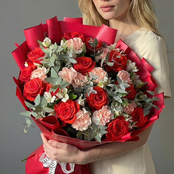 Ярко-красные розы «Нина», белая альстромерия, кремовые гвоздики и свежий эвкалипт — это не просто букет, а целая история. Идеален для тех, кто хочет подарить не просто цветы, а целое настроение.