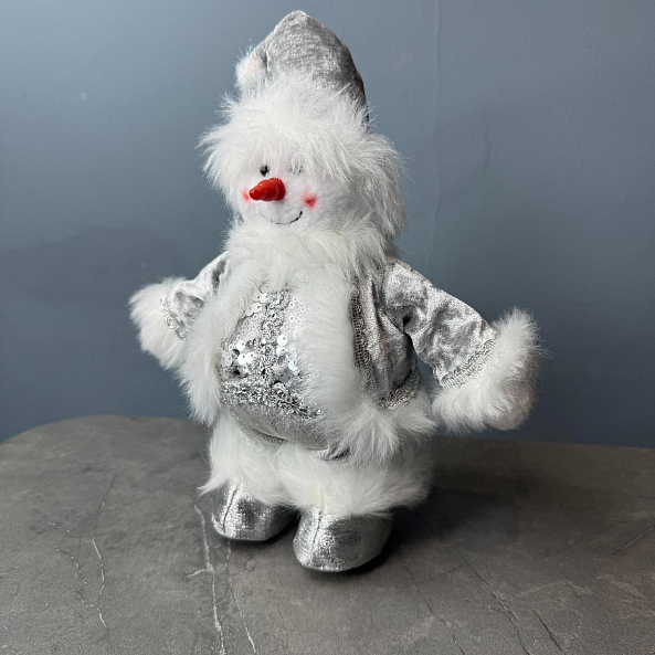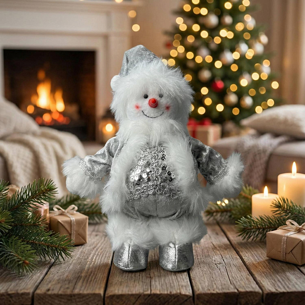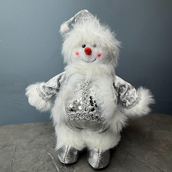 Пушистый снеговик в серебряном костюме с пайетками — не просто украшение, а символ праздника и детства. Идеален для дома, офиса или в качестве подарка.