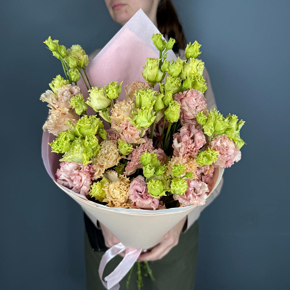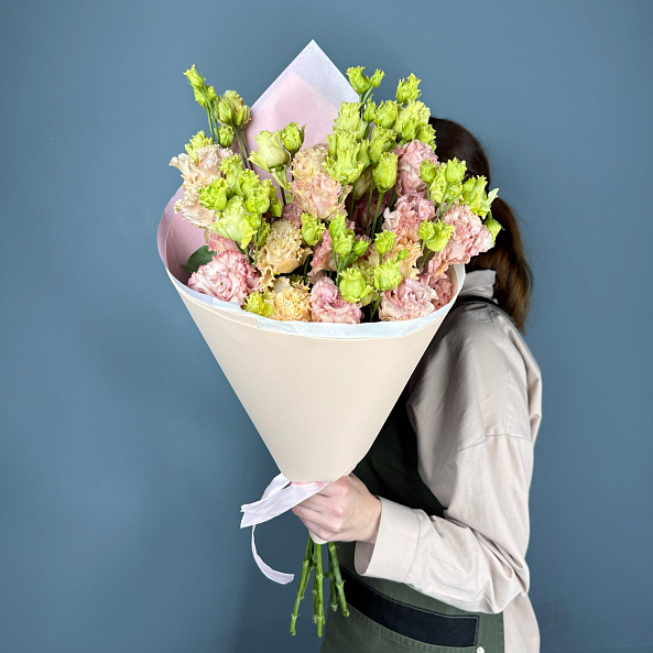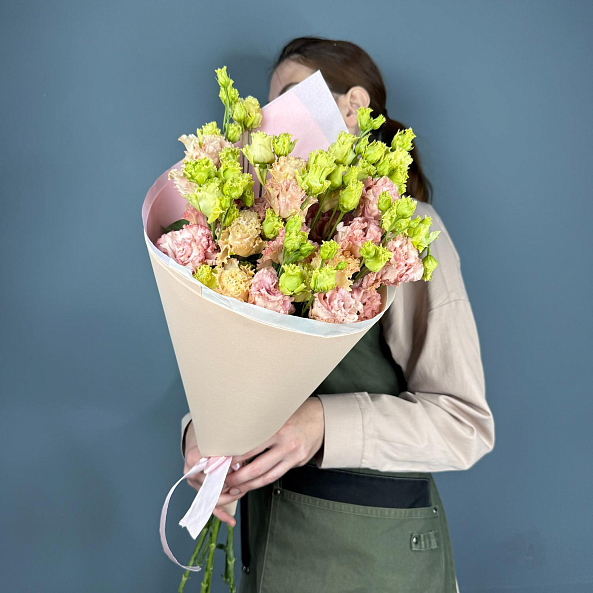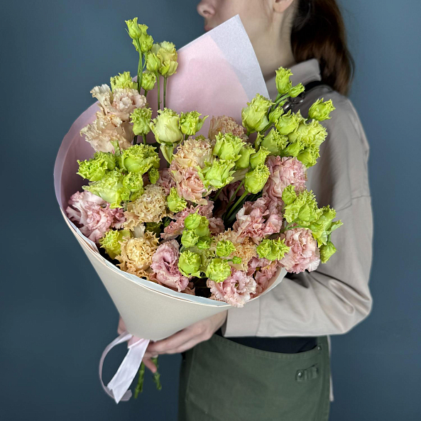 Теплое солнце в каждом бутоне. Персиковая махровая эустома — это нежность, уют и женственность, воплощённые в цветке. Её мягкие лепестки, словно вырезанные из атласа, добавят вашему букету романтики и свежести.