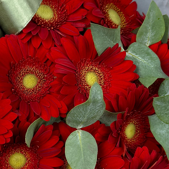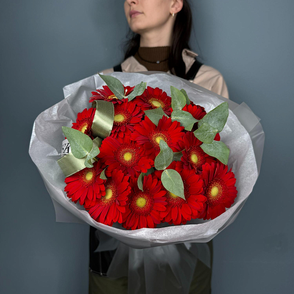 Гербера (мини) "Красная" 15 шт, Эвкалипт.