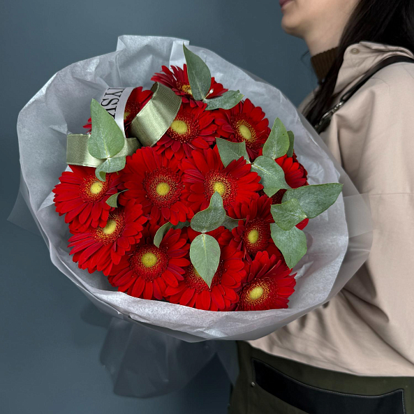 Яркий и энергичный букет из 15 мини-гербер «Красная» с их сочным, насыщенным цветом. Каждый цветок — это взрыв позитива и тепла. Свежие веточки эвкалипта добавляют легкости, природной текстуры и тонкий аромат. Упакован в матовую бумагу с лентой — идеальный выбор для тех, кто хочет подарить заряд радости, страсти и позитива — будь то день рождения, благодарность или просто повод порадовать близкого человека.