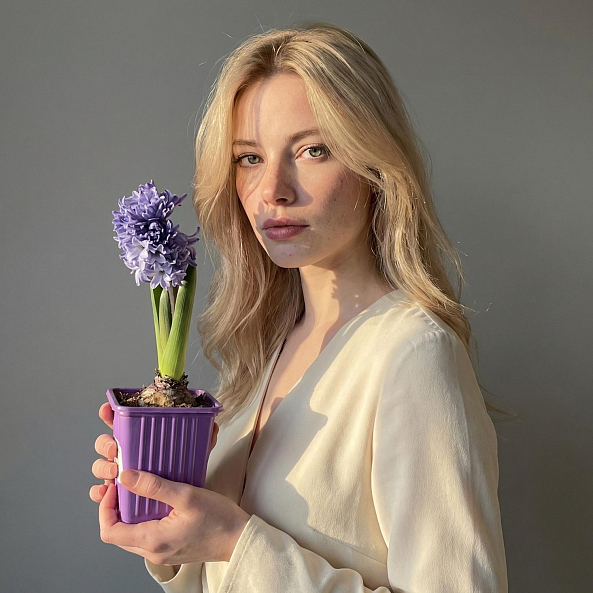 Гиацинт — луковичное растение. Образует мощный цветонос, украшенный пышным соцветием из мелких цветков колокольчатого типа. Цветет весной, в домашних условиях используется для выгонки. Поставляется в горшке диаметром 7 см.