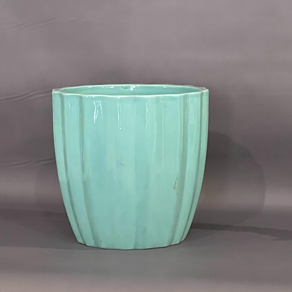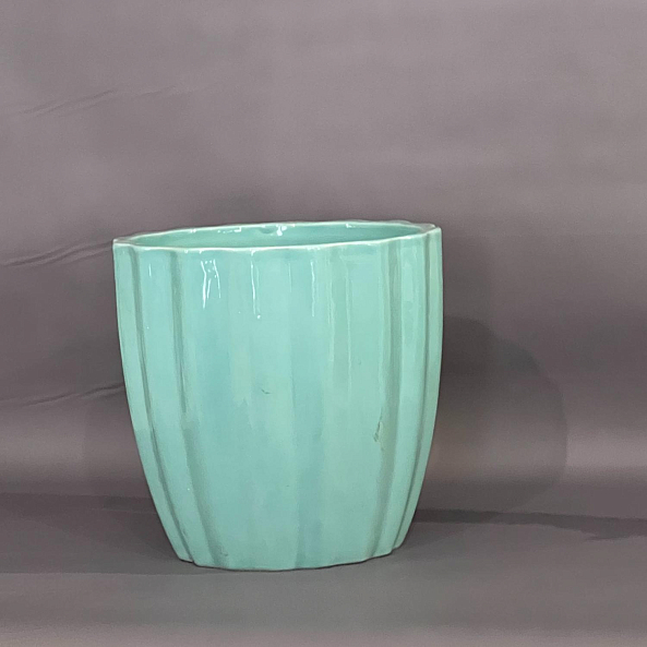 Керамическое **кашпо бирюзового цвета** с глянцевой поверхностью и рельефной вертикальной текстурой — стильное и современное решение для интерьера.
