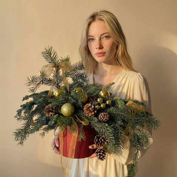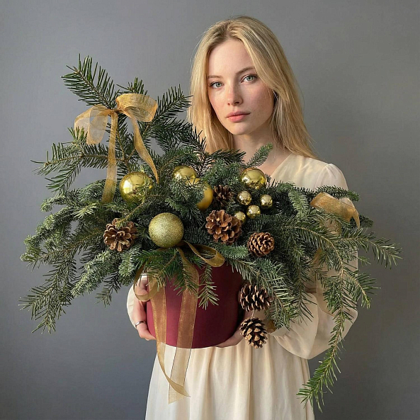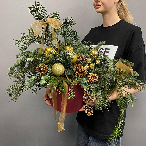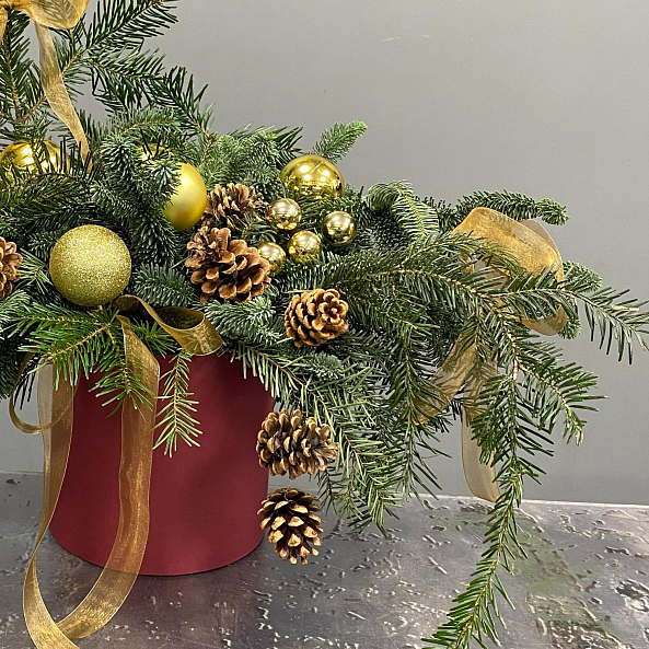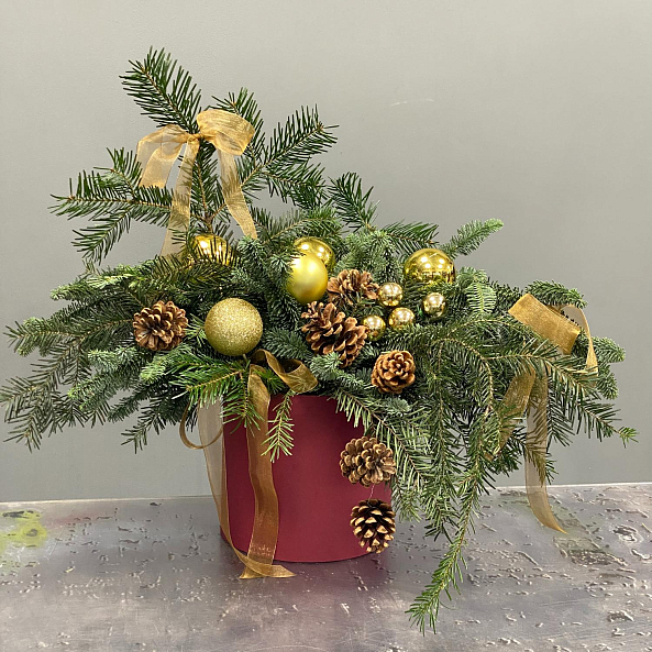 Композиция в коробке. Пихта, Нобилис, Новогодние шары, Шишки.