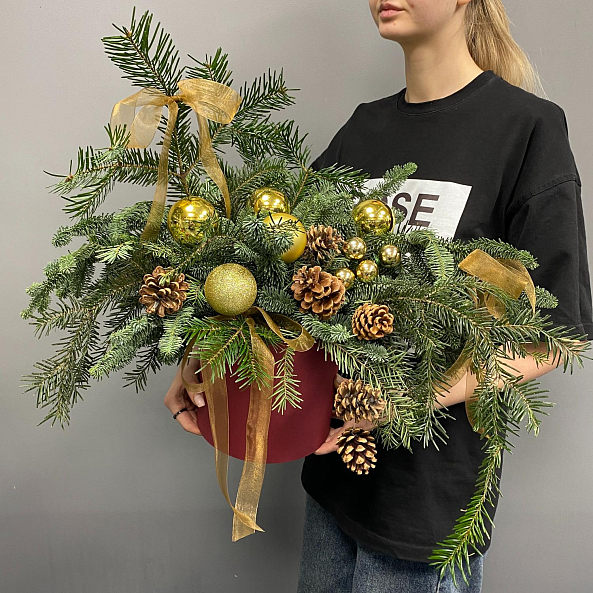 Свежая хвоя, золотые шары, натуральные шишки и бархатное кашпо — это не просто украшение, а целая атмосфера праздника. Идеальна для дома, офиса или в качестве подарка.