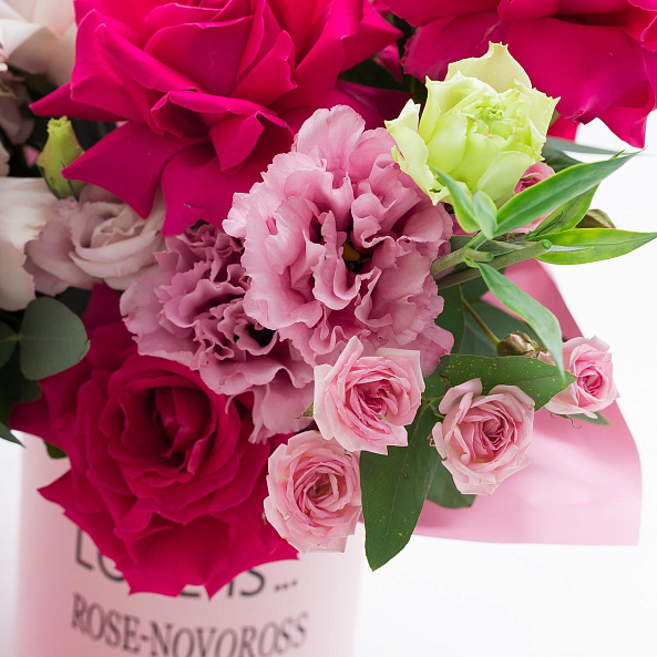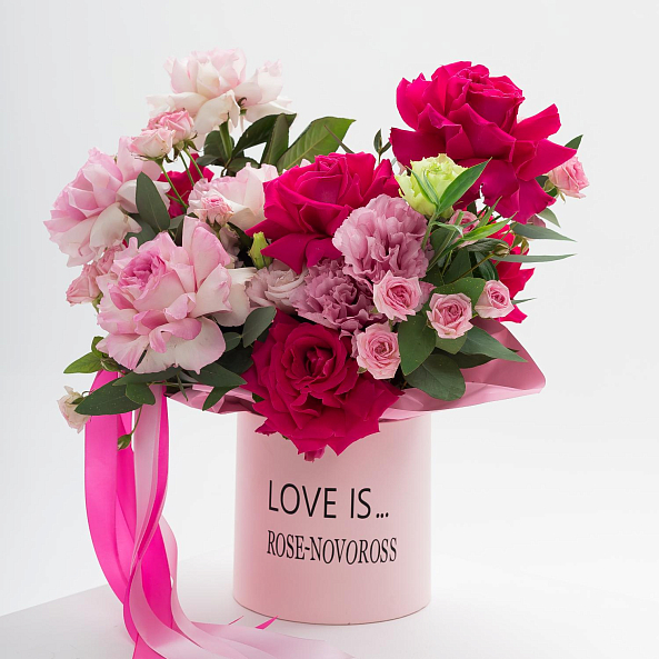 Погрузитесь в мир бесконечной романтики с этим изысканным букетом, где нежные пастельные розы, ярко-розовые пионы и пышные гвоздики создают симфонию цветов, напоминающую закат, застывший в самом сердце любви. Каждый лепесток, от мягкого персикового до глубокого фуксия, дышит теплом и страстью, а свежая зелень эвкалипта добавляет композиции легкости. Все это объединено в розовой цилиндрической коробке с загадочной надписью «LOVE IS» и логотипом «ROSE-NOVOROSS», превращая букет в не просто подарок, а живое послание, которое останется в памяти навсегда.