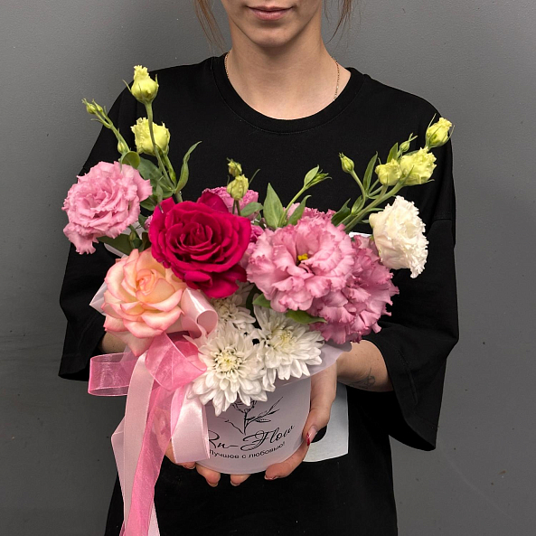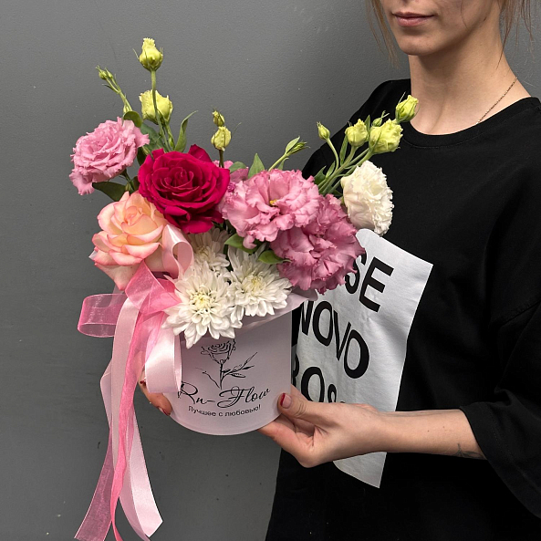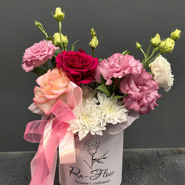 Коробка с цветами. Эустома Махровая Белая, Нежно-Розовая, Хризантема кустовая "Алтай", Роза "Джумилия", Роза "Мадам Церайс", Кустовая пионовидная "Мисти Баблс".