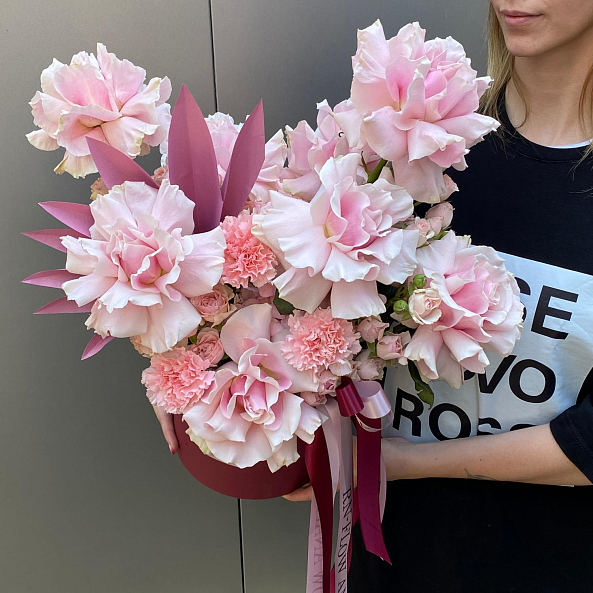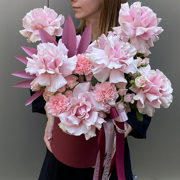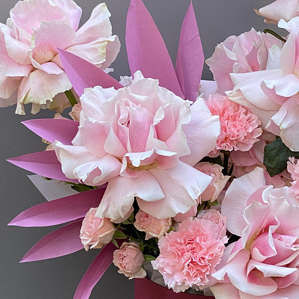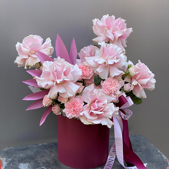 Коробка с цветами. Французская роза розовая "Пинк Мондиаль", Гортензия Нежно-Розовая, Кустовая кремовая роза "Полина", Гвоздика Нежно-Розовая.