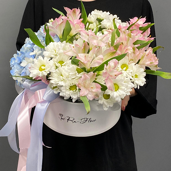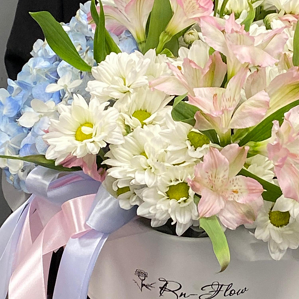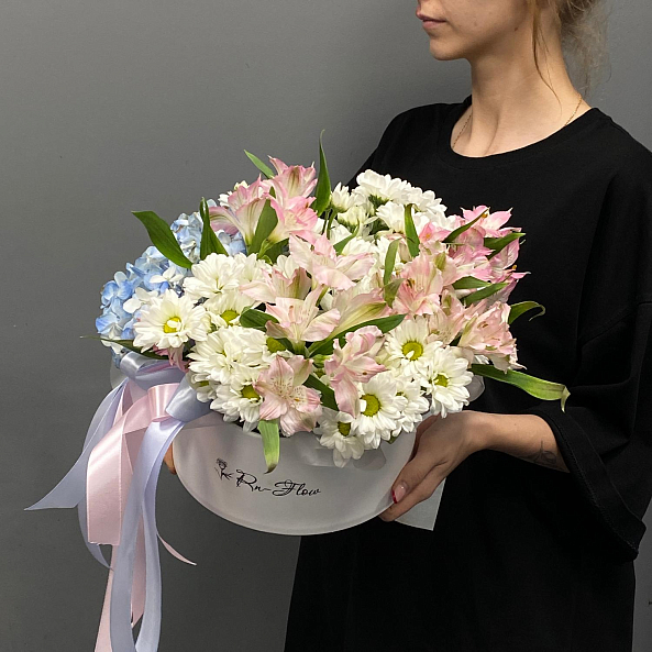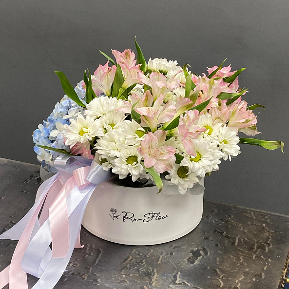 Изысканная композиция в стильной коробке — гармония нежных оттенков и текстур. Голубая гортензия придаёт объём и спокойную элегантность, её пышные соцветия словно облачка в небе. Розовая альстромерия добавляет мягкости, романтичности и изящной воздушности.