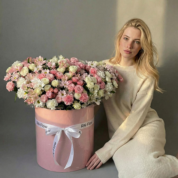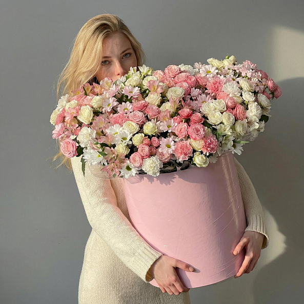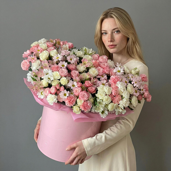 Подарите себе или близкому человеку настоящий взрыв нежности и радости с этой грандиозной коробкой цветов! Наша XXL-композиция — это не просто букет, а целый цветущий сад, созданный для того, чтобы поразить своей красотой и наполнить пространство ароматом свежести и любви.