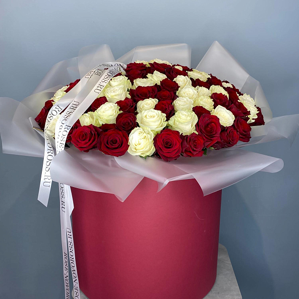 Коробка с цветами: 101 роза "Эксплорер" и "Мондиаль" из Эквадора (Премиум)