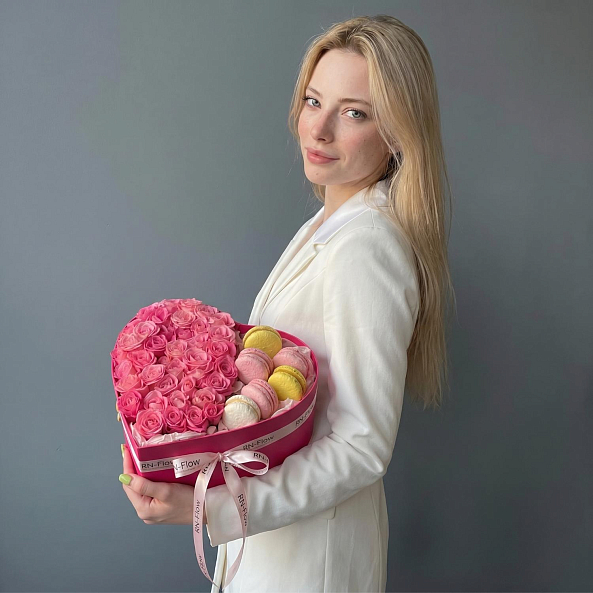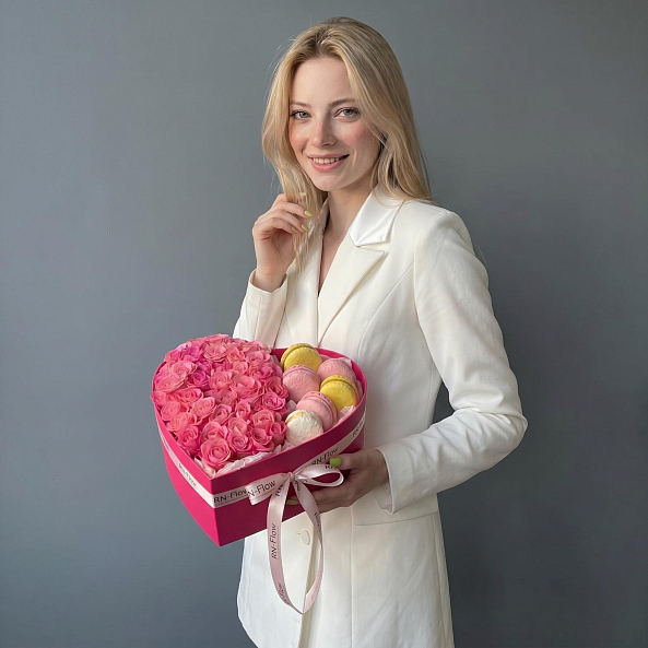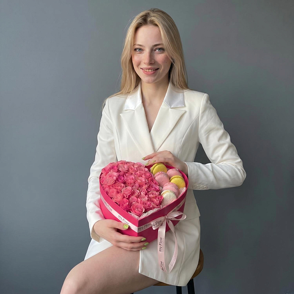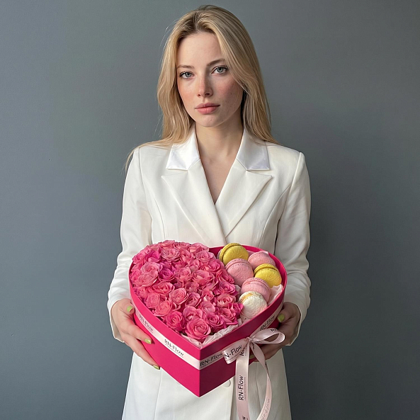 Коробка «Сердце Нежности: Кустовая Роза «Лиана» и Премиум-Макаруны»