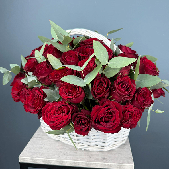 Букет из 51 красной розы в белой плетёной корзине — символ глубокой, страстной и вечной любви. Насыщенный бордовый цвет, идеальная форма бутонов и свежий эвкалипт создают роскошный, объёмный и очень романтичный образ. Идеален для самого важного признания или особенного праздника.