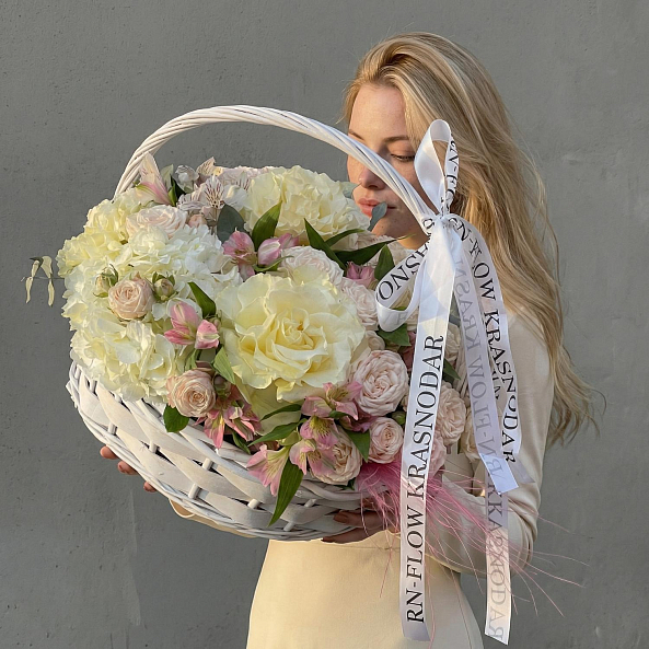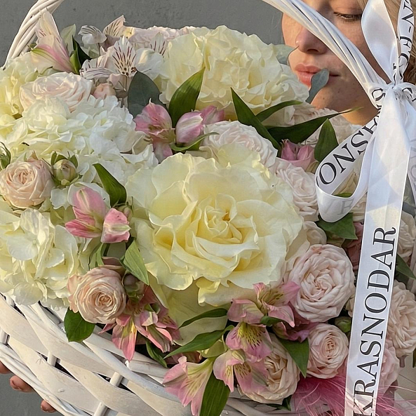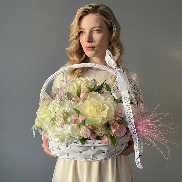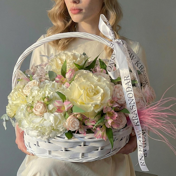 Корзина «Белое великолепие» — Розы + Гортензия + Альстромерия