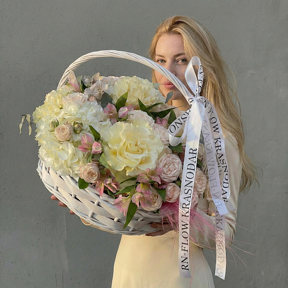 Корзина с цветами. Французская Роза "Мондиаль", Кустовая Пионовидная Роза "Мисс Пиони", Гортензия Белая, Альстромерия, Сухоцвет.