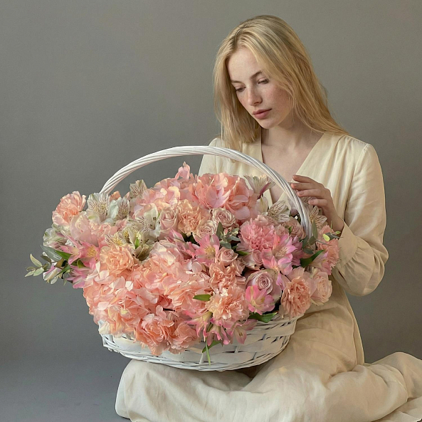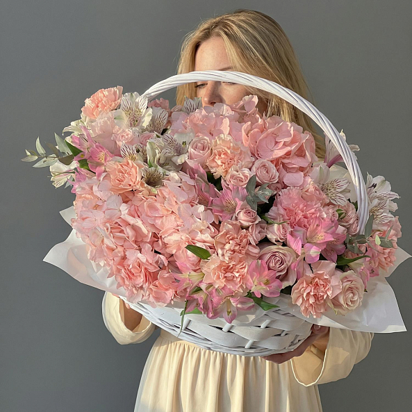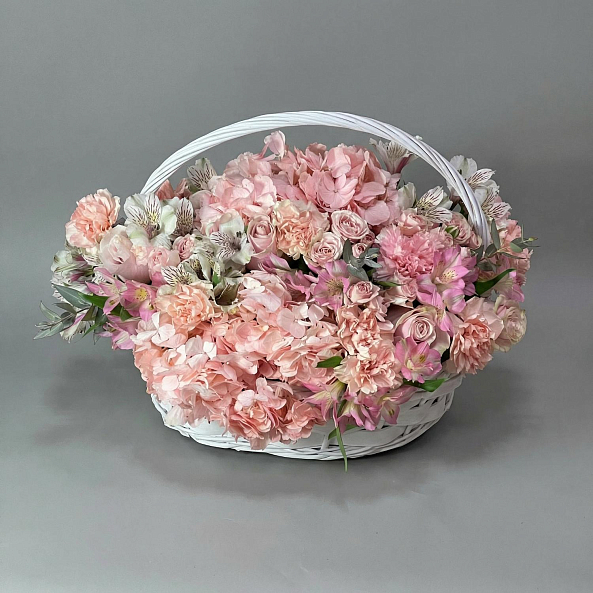 Корзина «Нежный рассвет» — Гортензия + Альстромерия + Роза + Гвоздика