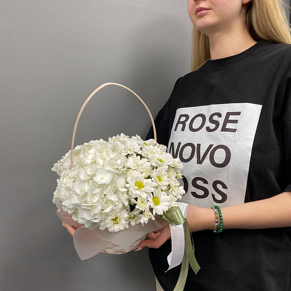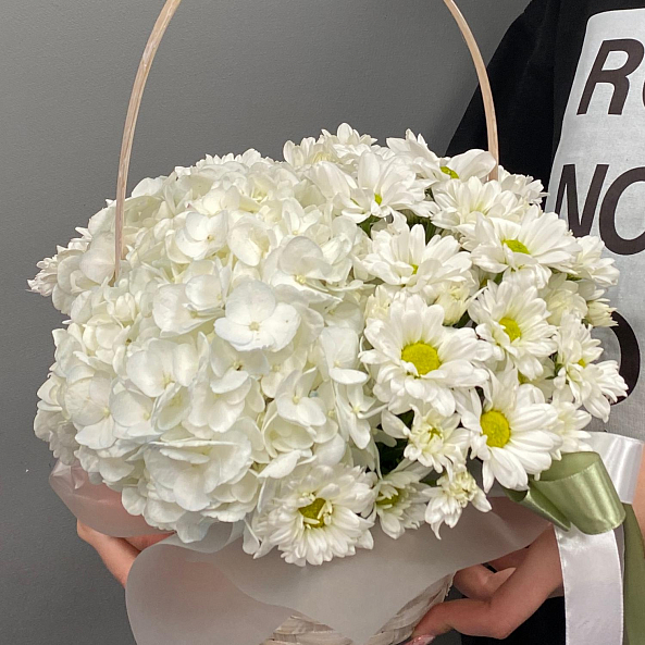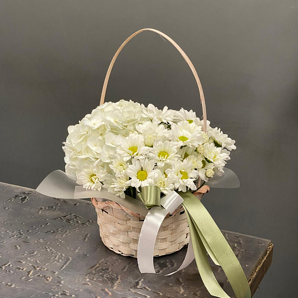 Корзина с цветами. Гортензия Белая, Хризантема Кустовая.