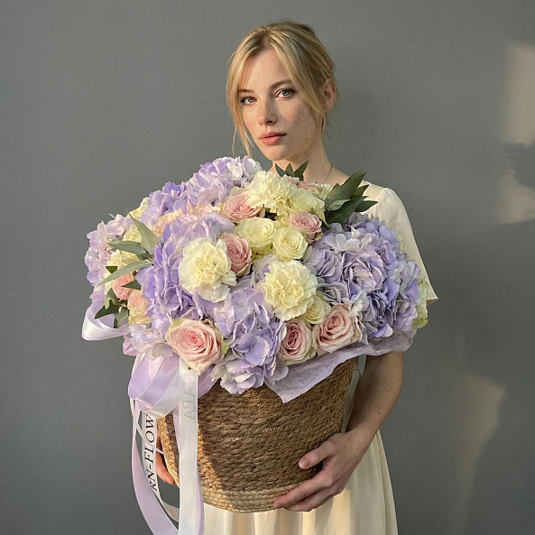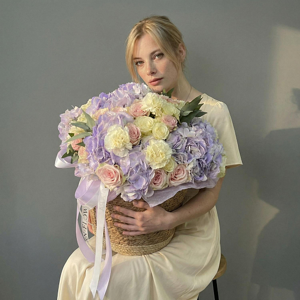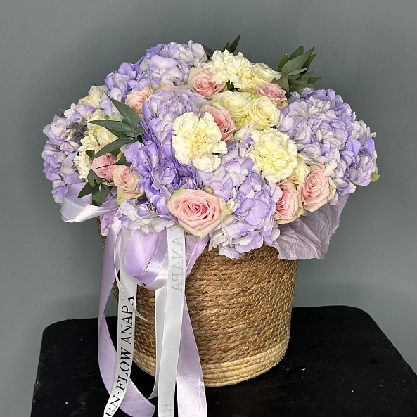 Эта изысканная композиция — воплощение нежности и утонченной элегантности. В центре — пышные гортензии в оттенках лаванды, создающие объем и воздушность, дополненные роскошными розами «Пинк Атена» с их нежно-розовым градиентом. Мелкие диантусы добавляют текстуры и уюта, а веточки эвкалипта придают свежесть и завершённость образу. Упакованная в плетеную корзину с атласной лентой, композиция выглядит лаконично и стильно, идеально дополняя любой интерьер или момент.