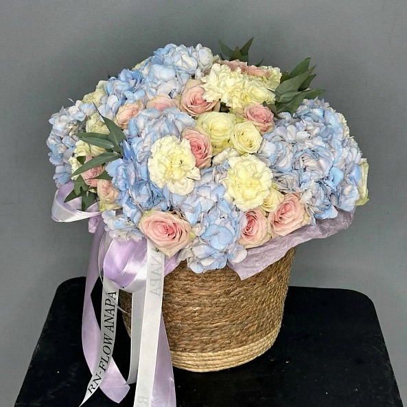 Корзина с цветами. Гортензия, Роза "Пинк Атена", Диантус, Эвкалипт.