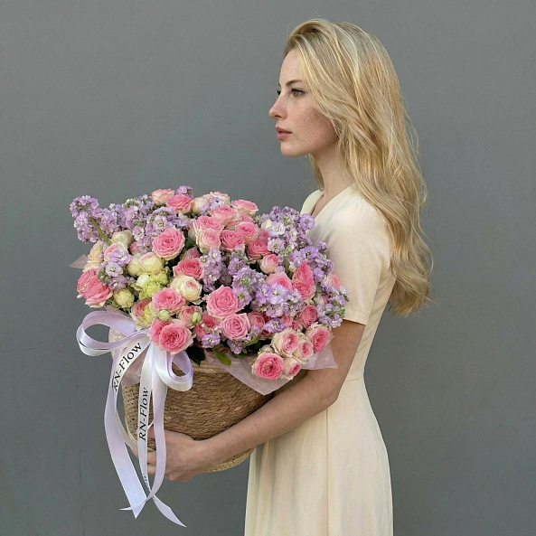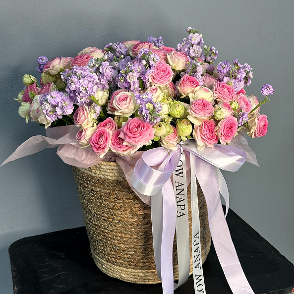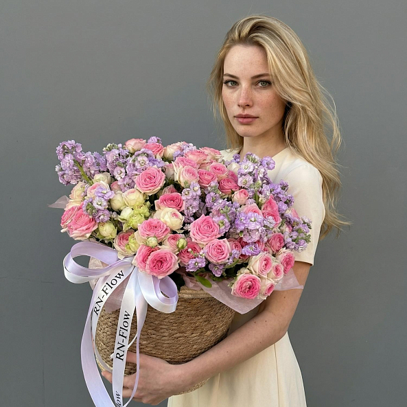 Корзина с цветами. Кустовая Пионовидная Роза "Джелато", Маттиола Лавандовая.