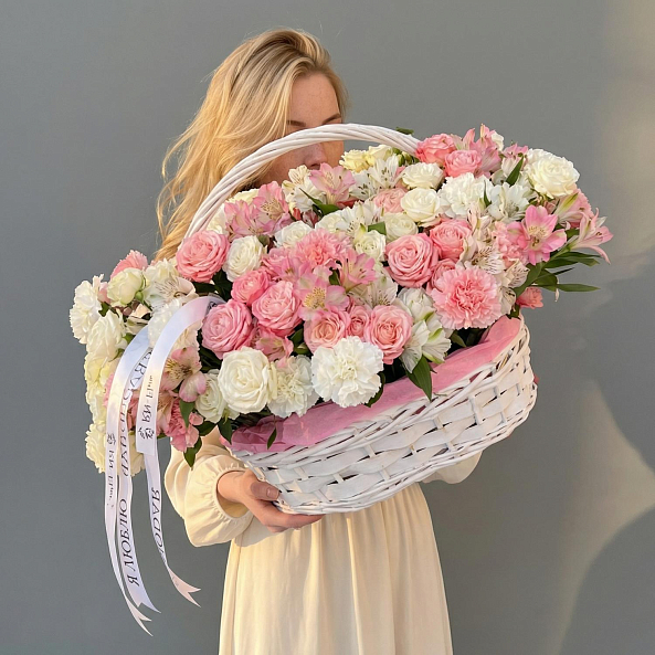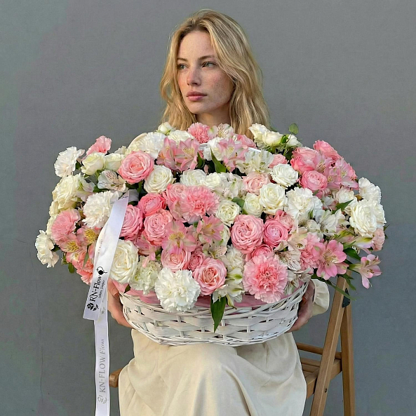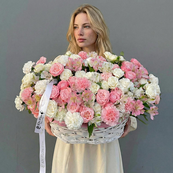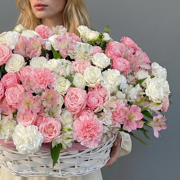 Корзина «Цветочная нежность» — Розы «Мисс Пиони» + «Вайт Пиони» + Альстромерия + Гвоздика