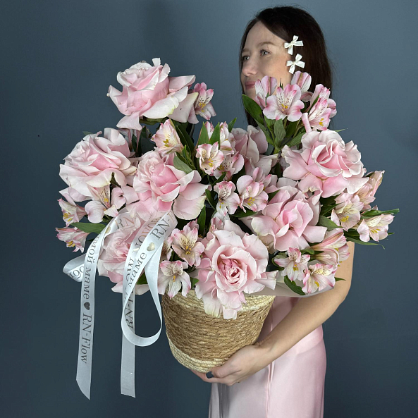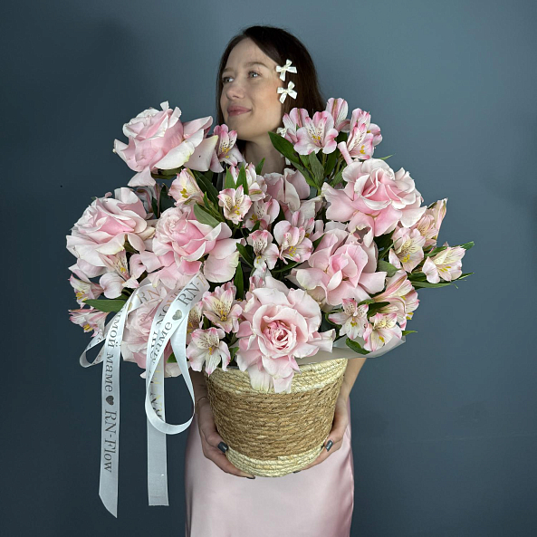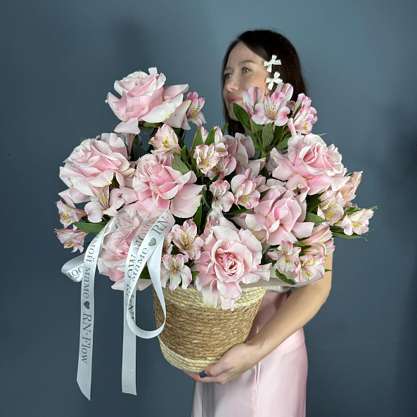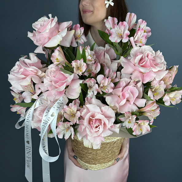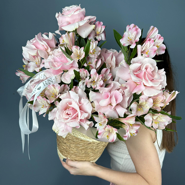 Корзина с цветами. " Мой самый тёплый день". Французская Роза, Альстромерия.