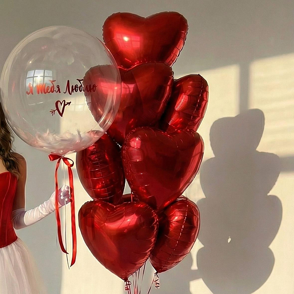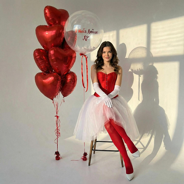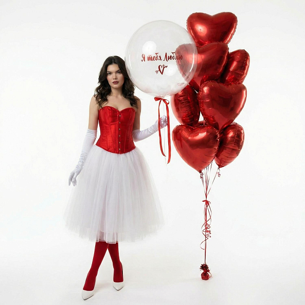 Позвольте вашим чувствам говорить громче слов! Набор воздушных шаров, созданный для тех, кто ценит нежность и глубину эмоций: прозрачный шар с трогательной надписью «Я тебя люблю» и акцентом в виде сердечка, дополненный пышной композицией из блестящих красных сердец. Каждый элемент — от изысканного красного корсета до белоснежной юбки-тюль — подчеркивает атмосферу романтики, идеальную для первого свидания, дня святого Валентина или особого признания в любви. Подарите близкому человеку момент, где простые шары становятся символом вечных чувств, а каждый взгляд наполняется теплом. Ведь настоящая любовь — в деталях, которые вы создаете вместе.