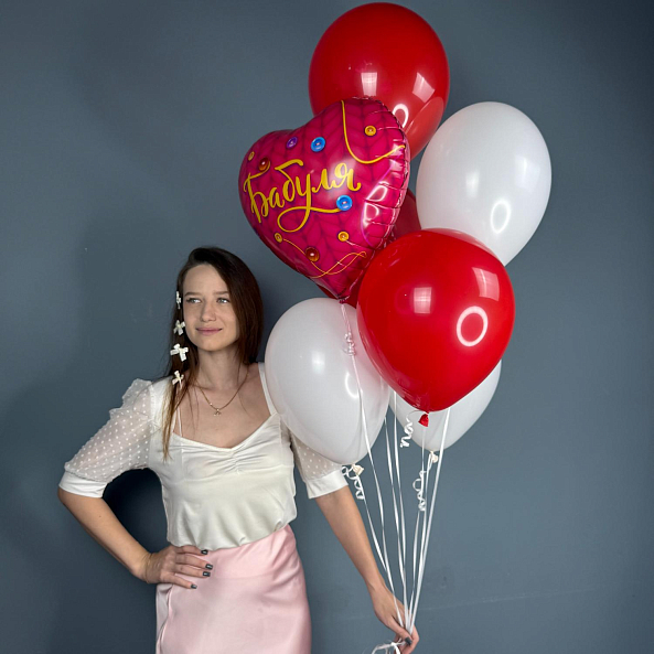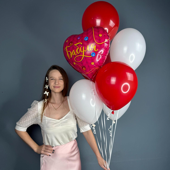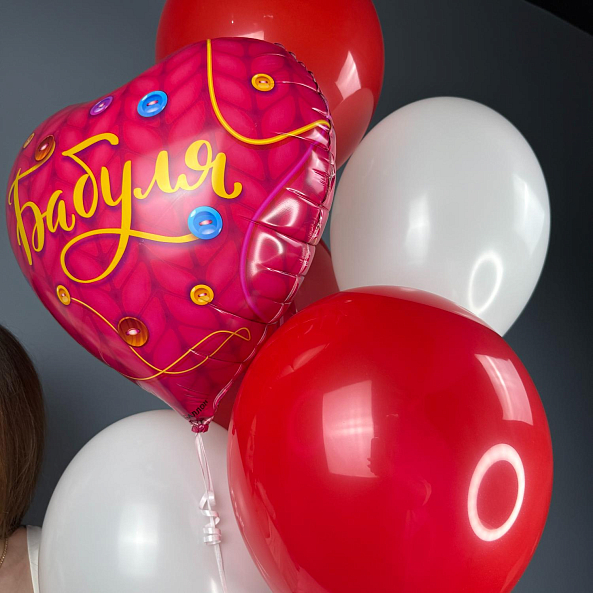 Тёплый и трогательный набор шаров для бабушки — с ярким сердцем, на котором золотыми буквами написано «Бабуля», и классическими красными и белыми шарами. Идеальный акцент к празднику, дню рождения или просто для того, чтобы порадовать любимую бабушку — символ любви, уважения и благодарности.
