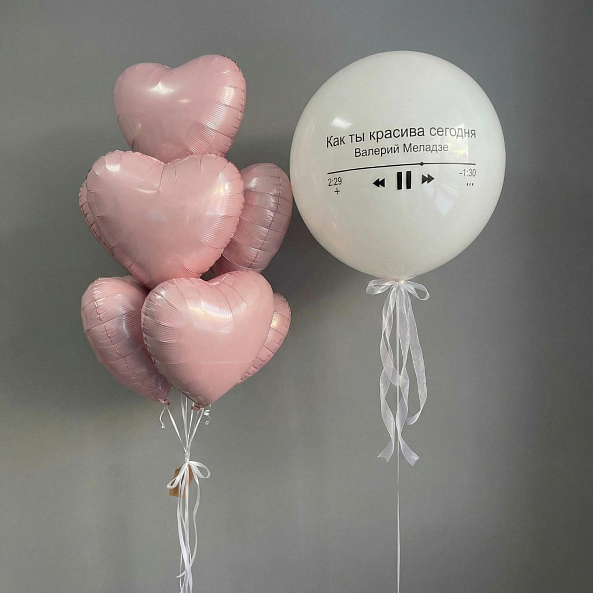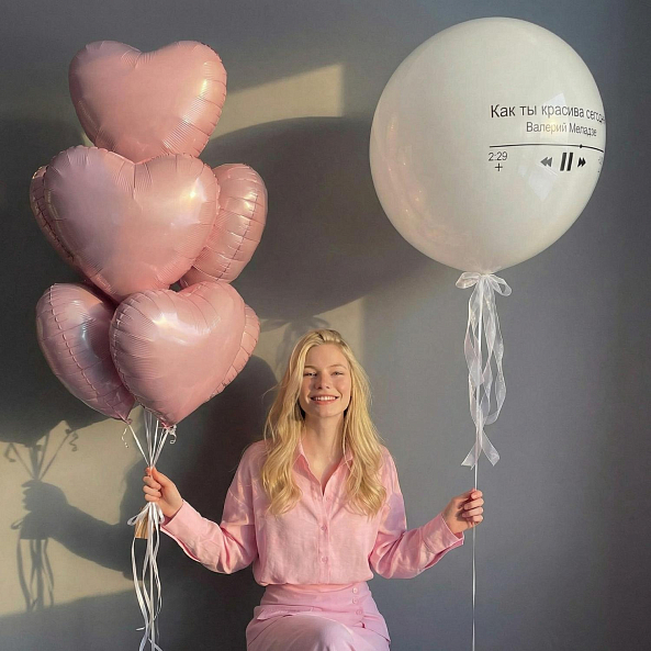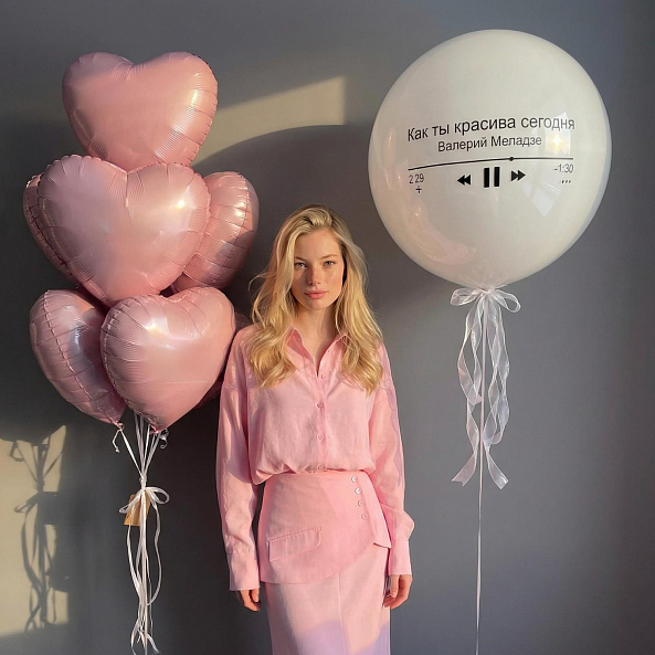 Этот уникальный набор — не просто декор, а искреннее восхищение, которое парит в воздухе! Центральный элемент — большой белый шар с надписью «Как ты красива сегодня» и имитацией музыкального проигрывателя (с именем исполнителя Валерий Меладзе), словно застывшая мелодия, которая говорит больше слов. В комплекте — розовые сердца, создающие атмосферу тепла и романтики.