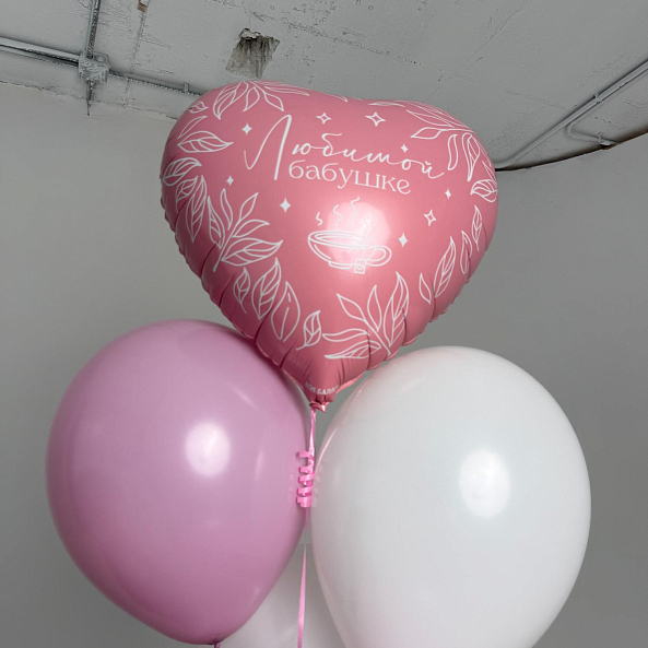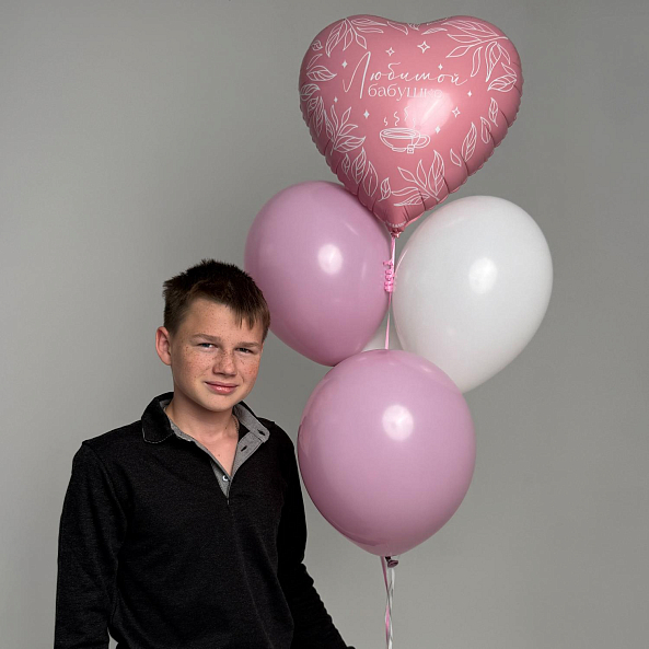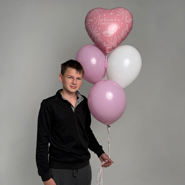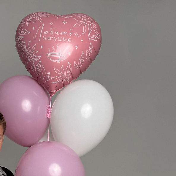 Нежный и трогательный набор шаров — идеальный подарок от внука для любимой бабушки. В центре композиции — большое розовое сердце с надписью «Любимой бабушке» и изящным узором. Дополнен пастельными розовыми и белыми шарами, создавая атмосферу тепла и нежности. Идеально подойдет для Дня рождения или просто чтобы порадовать самую родную. Теще, свекрови