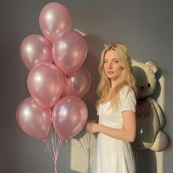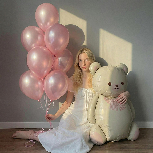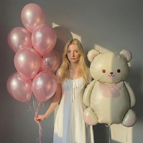 Погрузитесь в мир уюта и волшебства с этим очаровательным набором, где пышная композиция из розовых латексных шаров встречается с гигантским фольгированным медвежонком в нежных оттенках крема и розового. Каждый шар, словно укутанный в утренний туман, переливается мягким металлическим блеском, а медвежонок с розовым клетчатым бантиком и улыбкой, которая тает сердце, становится символом тепла и заботы.