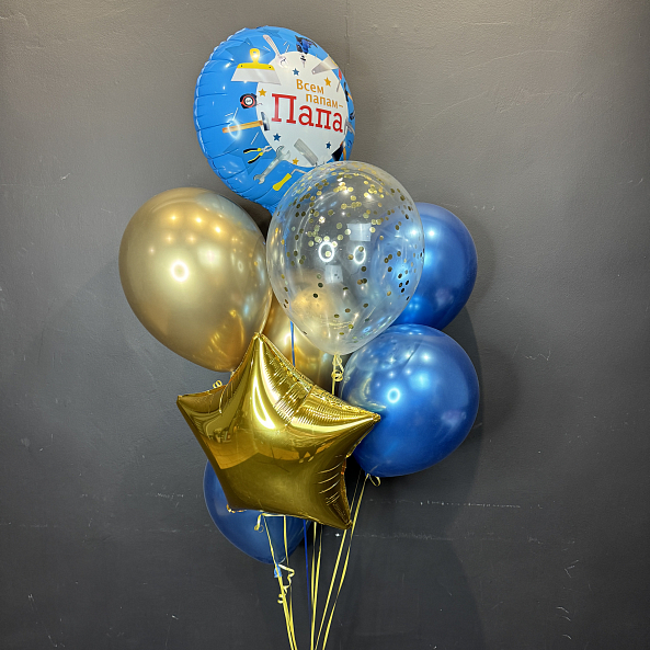 Стильный и праздничный набор для настоящего героя — с фольгированным шаром в тематике «мастер на все руки», золотой звездой, блестящими синими и прозрачными шарами с конфетти. Идеальный подарок на День отца, день рождения или просто для того, чтобы сказать: «Ты лучший!»