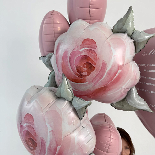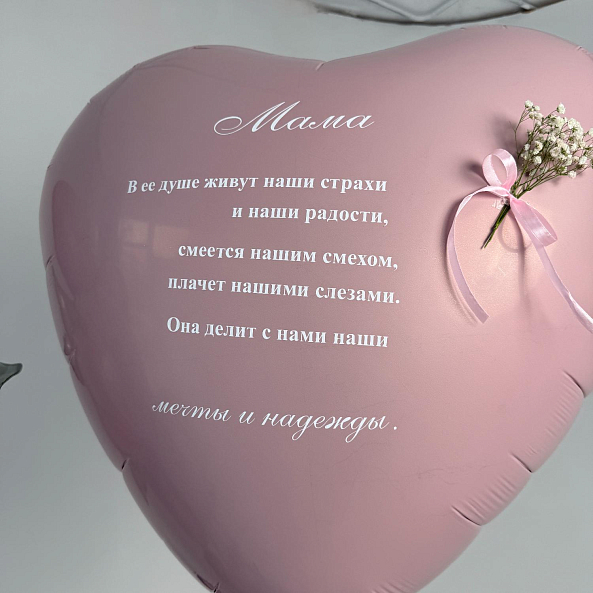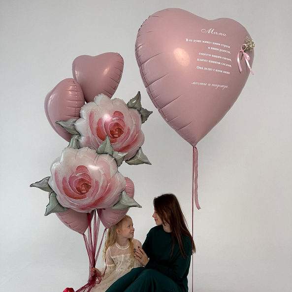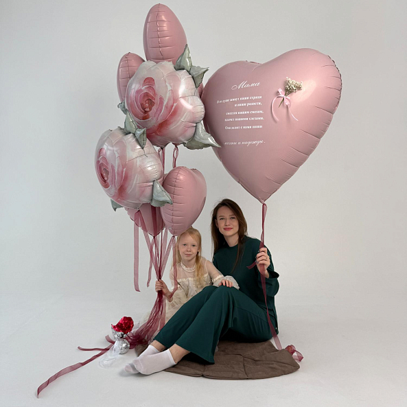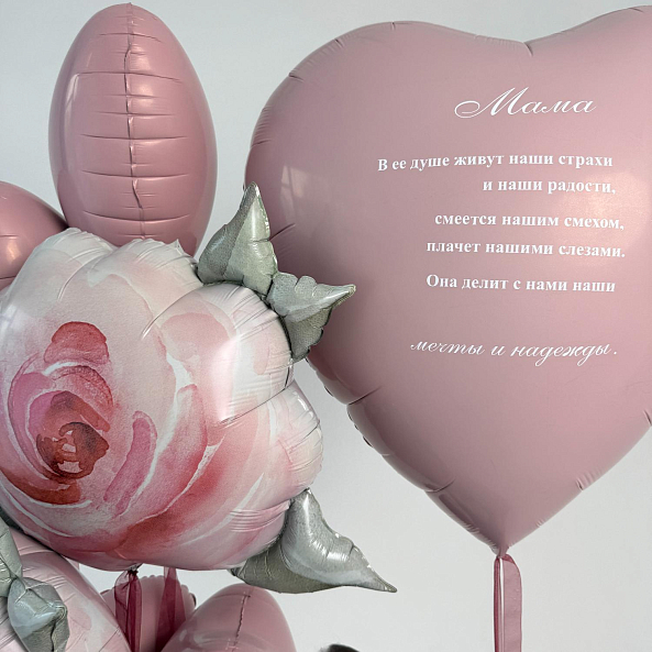Нежный набор шаров в розовых тонах — идеальный подарок для мамы. В комплекте огромное сердце с трогательным стихотворением и объемные розы, символизирующие любовь и благодарность. Идеально подойдет для Дня матери, дня рождения или любого другого повода, чтобы порадовать самую родную.