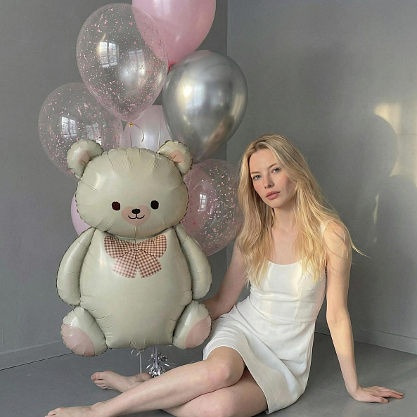 Шар фольгированный, Сатин Мишка кремовый с бантиком 87 см — 1 штука
