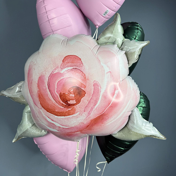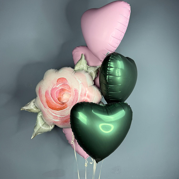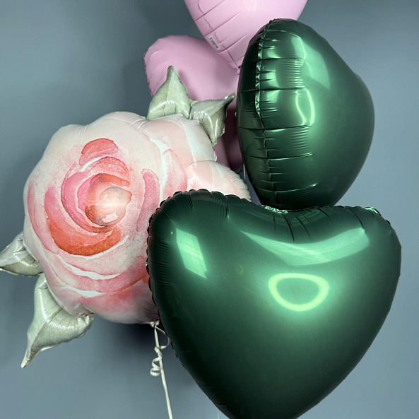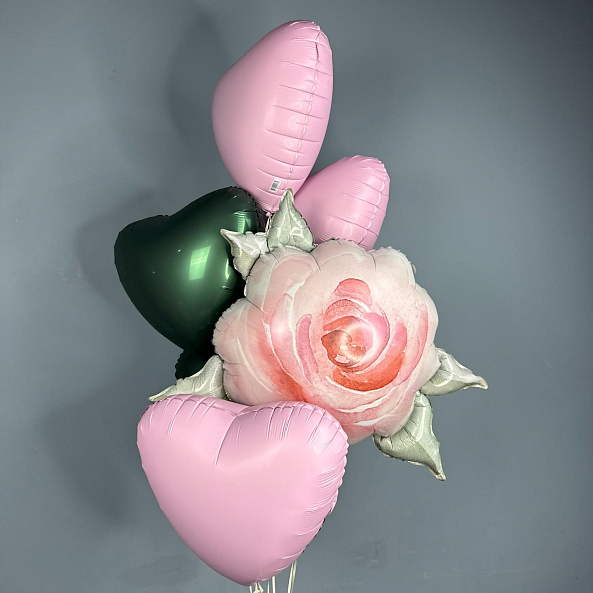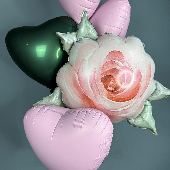 Романтичный набор из фольгированных шаров в нежных тонах. Центральным элементом — объемная роза с акварельным эффектом, дополненная розовыми и зелеными сердечками. Идеально подойдет для Дня Святого Валентина, дня рождения или любого повода, чтобы порадовать близкого человека.