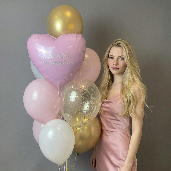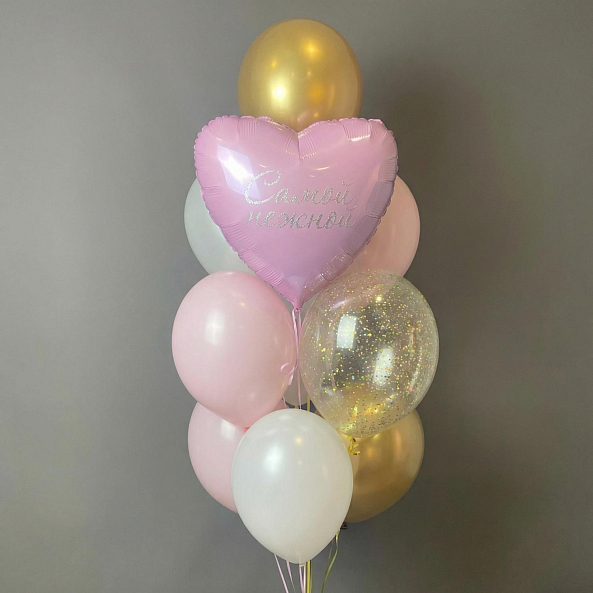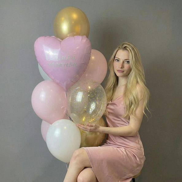 Этот изысканный набор — не просто декор, а искреннее послание, которое передаст ваши чувства без слов. Центральный элемент — розовое сердце с надписью «Самой нежной», написанной серебряным почерком, словно застывшая нота любви. В комплекте — шары в пастельных оттенках розового, белого и золотого, а также объемные прозрачные шары с мерцающими блестками, создающие атмосферу праздника и уюта.