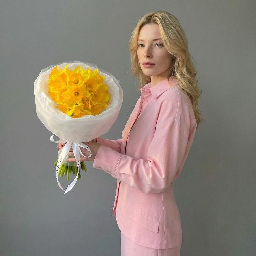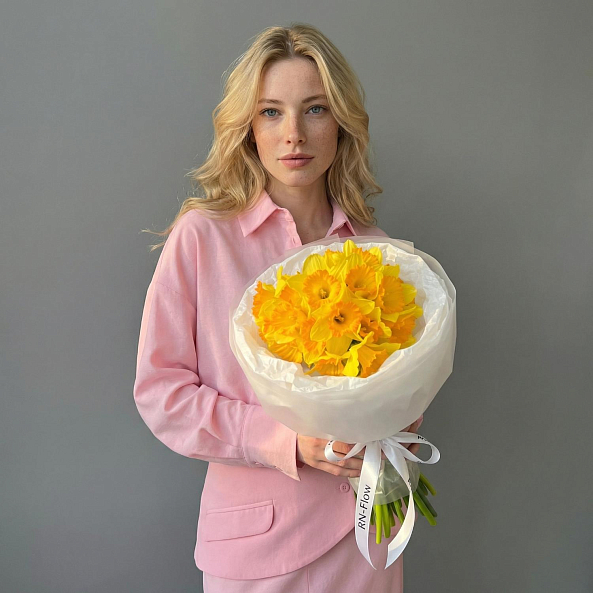 Этот яркий букет из желтых нарциссов — словно застывший луч весеннего солнца в ваших руках. Плотные соцветия с насыщенным золотистым оттенком и оранжевыми акцентами в центре дарят ощущение тепла и энергии, а длинные зеленые стебли придают композиции естественную грацию. Упакованный в нежную белую кальку с лентой «RN-Flow», букет выглядит лаконично и современно, идеально дополняя как повседневный образ, так и праздничное настроение.