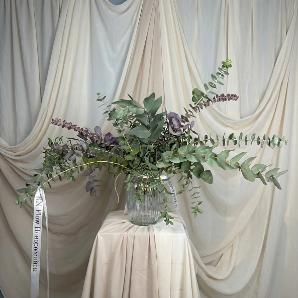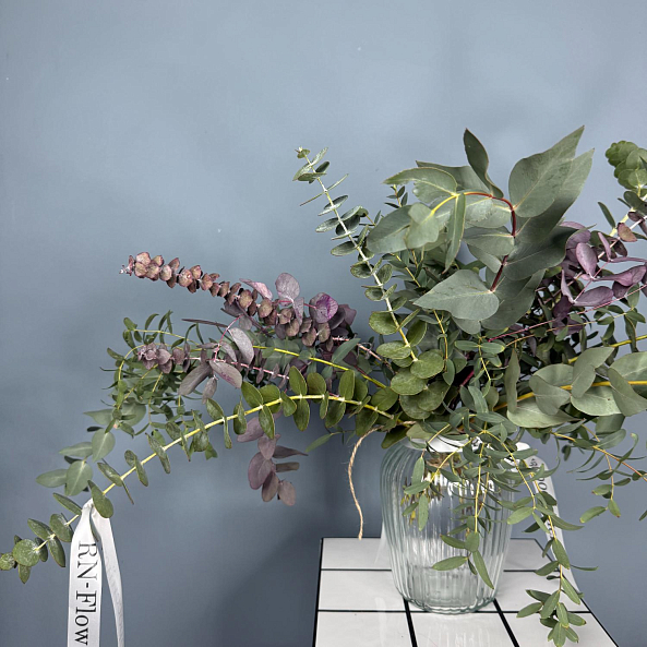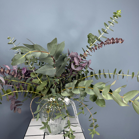 Натуральная, воздушная композиция из свежего эвкалипта с нежными серебристо-зелёными листьями и акцентами фиолетовой ветви. Идеальна как самостоятельный декор или для дополнения букетов — создаёт атмосферу спокойствия, уюта и природной гармонии.