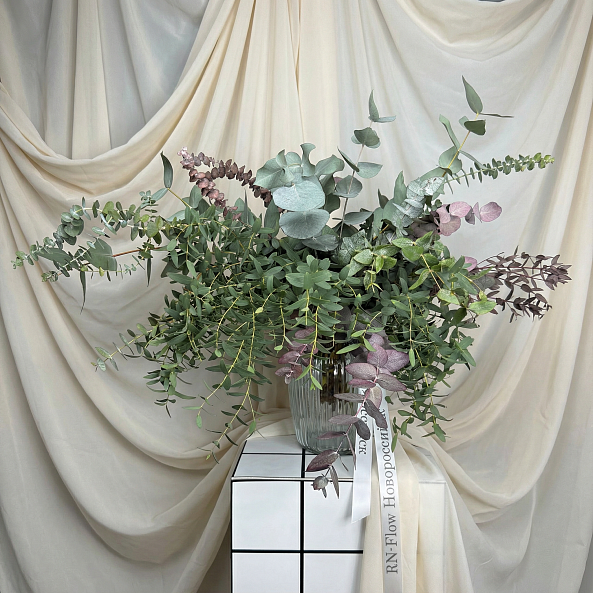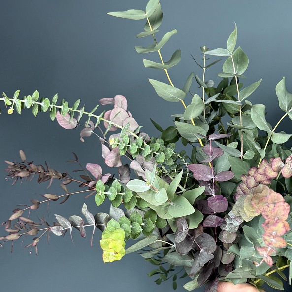 Натуральная, воздушная композиция из свежего эвкалипта с нежными серебристо-зелёными листьями и акцентами фиолетовой ветви. Идеальна как самостоятельный декор или для дополнения букетов — создаёт атмосферу спокойствия, уюта и природной гармонии.