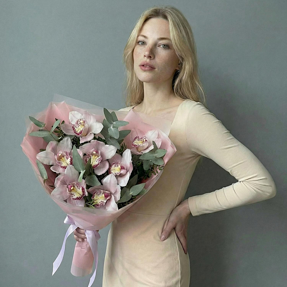 Экзотическая гармония, где изысканные орхидеи цимбидиум в нежно-розовых оттенках с фиолетовыми узорами в центре создают атмосферу утонченной роскоши. Каждый лепесток, словно расписанный художником, переливается мягким светом, а веточки эвкалипта добавляют свежести и естественной элегантности. Упакованный в прозрачную розовую кальку с атласной лентой, букет выглядит как живое произведение искусства, созданное для тех, кто ценит необычное и изысканное.