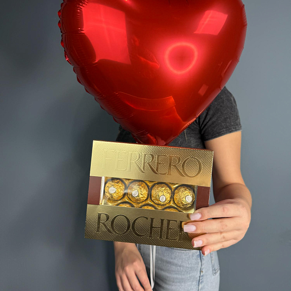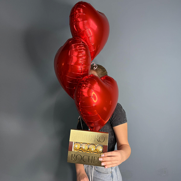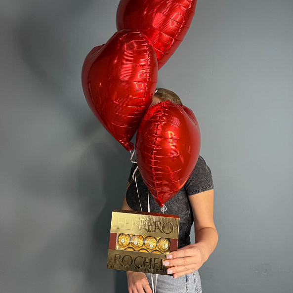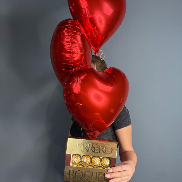 Набор шаров с конфетами Ferrero Rocher — яркий и романтичный подарок! Три блестящих красных сердечка-шара создают атмосферу любви и праздника. В комплекте — изысканная коробка с шоколадными конфетами Ferrero Rocher. Идеально подойдёт для Дня святого Валентина, годовщины или просто как тёплое признание чувств.