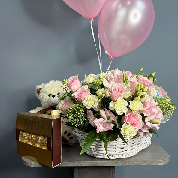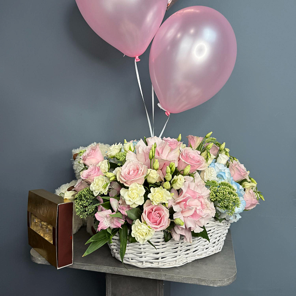 Элегантная корзина с цветами: розовая альстромерия, голубая гортензия, французская роза «Пинк Мондиаль», розовая роза «Пинк Атена», белая эустома, кустовая роза «Сноуфлейк» и свежий эвкалипт. В комплекте — шар сердце из розового золота, два перламутрово-розовых шара, мягкая игрушка 50 см (по наличию) и коробка конфет Ferrero Rocher. Идеальный подарок для Дня рождения, годовщины или романтического сюрприза.