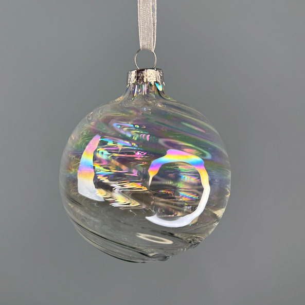 Прозрачный стеклянный шар с перламутровым и радужным эффектом — не просто украшение, а настоящий акцент на вашей ёлке. Идеален для тех, кто ценит изысканность, блеск и атмосферу праздника.